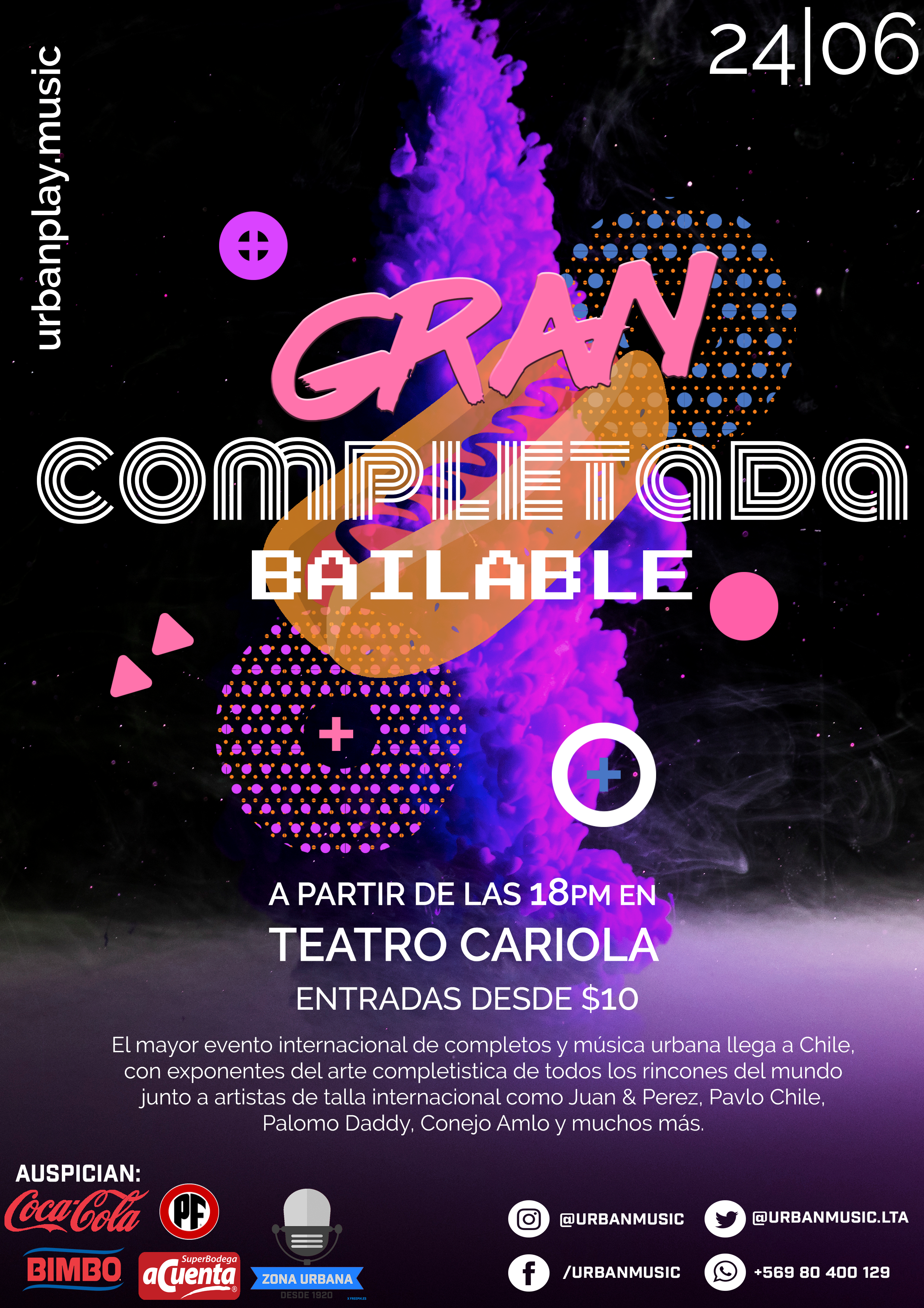 Invitamos a todos nuestros lectores a asistir a la GRAN COMPLETADA BAILABLE que realizaremos el día 24 de junio a partir de las 18PM en el teatro Cariola ( San Diego 246, Santiago ), este evento contará con stands alimenticios de franquicias de completos y, artistas del género urbano a nivel nacional e internacional.